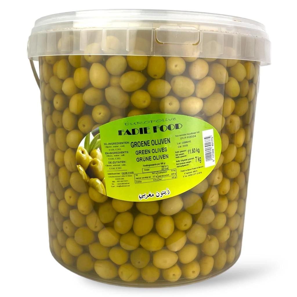 Fadie Food Green Pitted Olives 11.5kg – Large plastic bucket with 11.5kg of ready-to-use green olives without pits. Preserved in brine for freshness and authentic taste. Perfect for catering, restaurants, and wholesale use. Store in a cool, dry place and refrigerate after opening.
